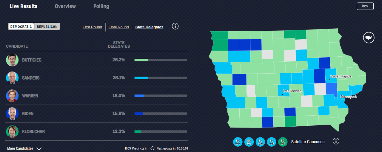 이러한 약점에도 불구하고 2020년 2월 7일발표한 민주당 경선 최종 결과에서, 피트 부티지지가 버니 샌더스를 26.2% vs 26.1%, 0.1%p차로 간신히 제쳤다. 1차 투표에서는 버니 샌더스가 피트 부티지지를 6,114표 차로 제쳤으나, 15% 미만 득표자를 찍은 유권자에 대한 2차 투표에서에서 피트 부티지지가 크게 득점하여 격차를 좁혔고 대의원에서 역전한 것.