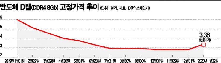 D램익스체인지에 따르면 PC에 주로 사용되는 D램(DDR4 8Gb 기준) 제품의 현물가격은 1월 22일 3.38달러로 지난달 초 기록한 저점인 2.74달러 대비 23% 급등했다. 2018년 하반기부터 가파르게 하락했던 D램 가격은 지난해 말 저점을 찍은 후 1월 반등세가 확연하다.