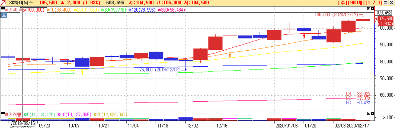 위의 차트를 보면 SK하이닉스 5일, 10일, 20일 단기이평선을 이미 상회하는 차트이고 거래량도 튀는 구간 없이 안정적으로 상승하는 것으로 보인다.