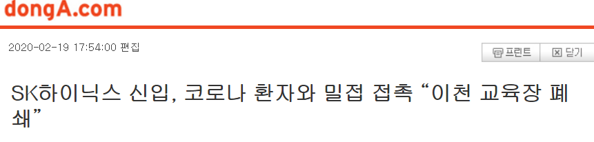 SK하이닉스에 따르면 지난 10일 입사한 생산직 신입사원이 확진자와 접촉한 이력이 있는 것으로 판명됐다. 이에 따라서 이천사업장 내 교육장(유니버시티, SKHU)를 폐쇄하고 방역조치를 마무리했다.