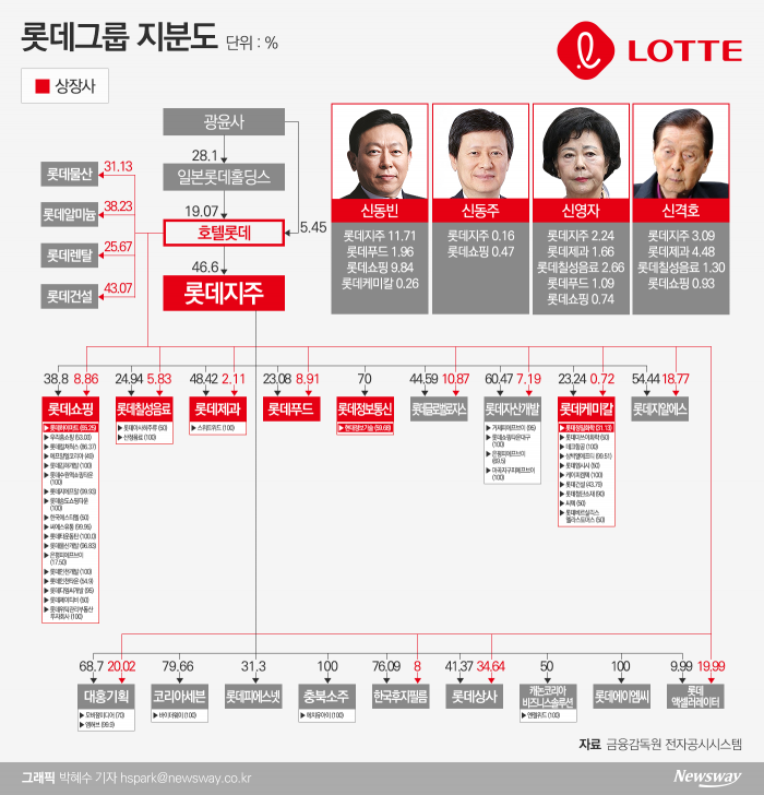 위는 롯데그룹의 지배구조와 롯데쇼핑의 주봉차트이다.