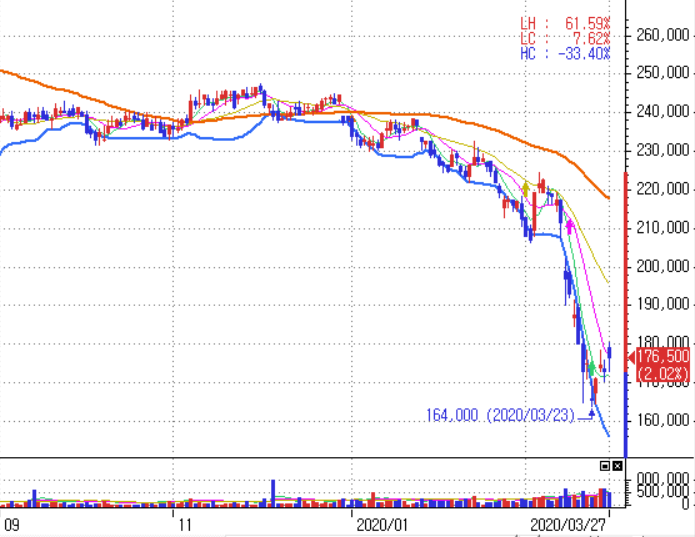 이러한 이유때문에 60주 이동평균선 아래로 주가가 하락하는 추세를 유지중이며, 단기 수급에서도 거래량이 나오면서 하락하는 흐름이다.