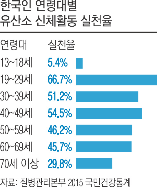 사회구조의 변화로 우리의 행복이 위협받은 것에 더하여 신체적인 변화도 발생했다. 위의 언급한 30대까지의 강요받는 라이프스타일은 우리의 신체에도 영향을 미쳤다. 우리나라의 13~18세의 유산소 신체활동 실천율은 5.4%로 전 연령대 중 최하위이다. 초중고생 비만율은 20%를 상회하기 시작했으며, 성장기의 비만은 평생을 비만으로 만들 확률이 높다.