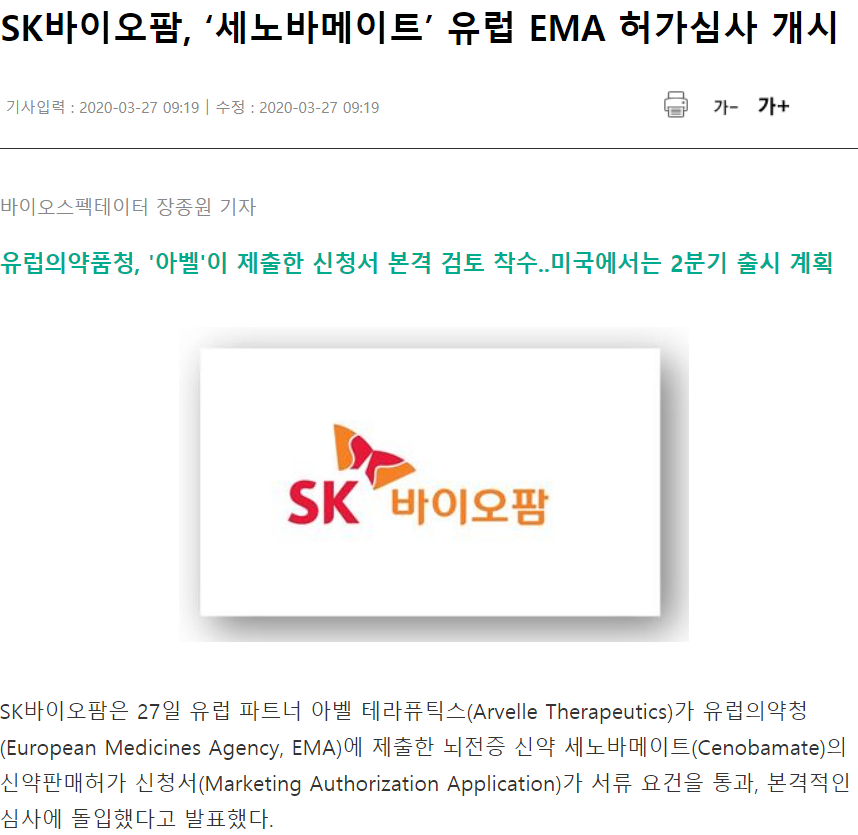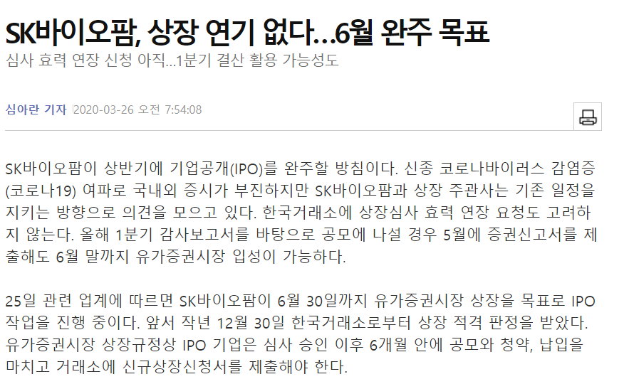 위 더벨의 기사를 보면 최근 코로나와 유가급락으로 인한 실물경제 불확실성에도 불구하고 SK그룹이 SK바이오팜의 상장을 연기하지 않는다는 내용이다.