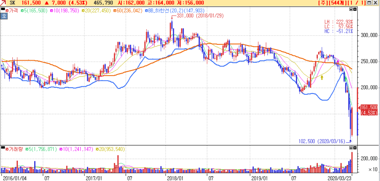 위 차트는 SK의 주봉이다. 굵은 주황색 선이 60주봉인데, 2018년 여름부터 주가가 하락했다가, 자사주매입과 SK바이오팜 상장으로 주가가 상승추세를 이루다가 코로나 사태로 주가가 급락했다.