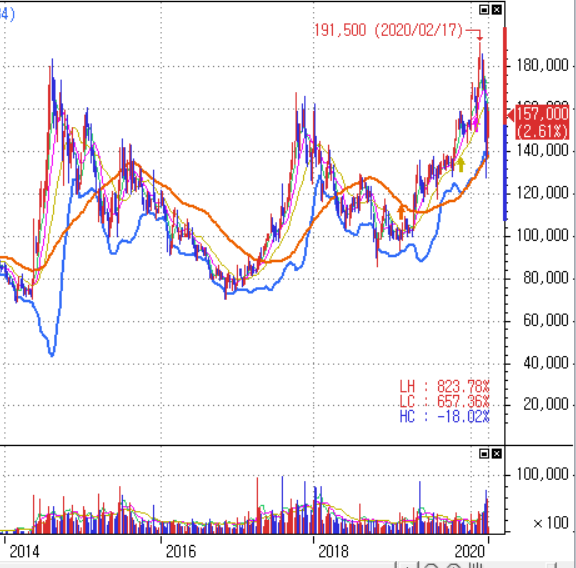 이후 주가가 150,000원 선을 돌파하며 거래량이 감소하기 시작한다. 이 뜻은 새로운 시장참여자들이 주식을 매입 후 저점대비 교환을 적게 했다는 뜻이다. 그 본질을 우리가 알 수는 없으나, 새로운 시장참여자들이 지금의 상승폭에도 불구하고 매도할 이유가 없다고 생각하고 있는 것을 알 수 있다.