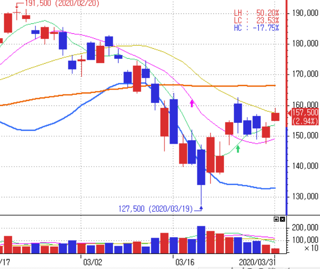 아래 일봉을 참고하면 3월 중순 127,500원 저점 때 가장 많은 거래량이 나왔다. 가격은 거래량의 그림자이다. 가격변동만을 그린 차트를 보기보다는 거래량과 함께 생각해야한다.