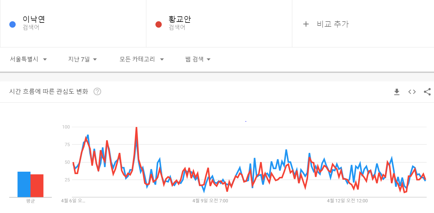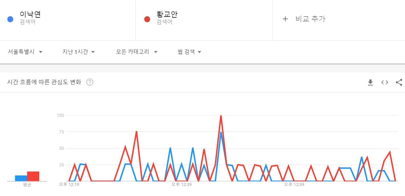 구글 트렌드로 서울특별시 지역의 7일, 1시간 동안의 두 후보의 트렌드를 알아보았다. 파란색이 이낙연 후보, 빨강색이 황교안 후보이다.