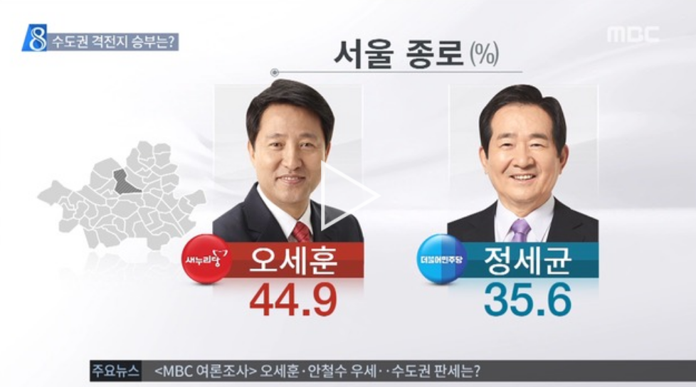 그래서 2016년 오세훈vs정세균 당시 여론조사를 찾아봤다. 놀랍게도 D-8 전 서울종로구의 여론조사에서 오세훈 후보가 10% 이상 앞서고 있다. 결과는 알다싶이 정세균의 승리로 돌아갔다.