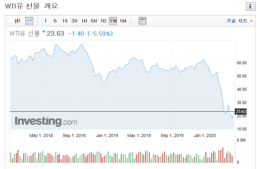 국제 유가는 지난 달 24일만 해도 서부텍사스유(WTI) 기준 배럴당 51달러에 거래됐지만, 한 달도 채 지나지 않은 지난 20일엔 22달러선까지 수직낙하했다. 지난 18일에는 전날보다 24.4% 대폭락해 간신히 20달러선에 턱걸이하면서 18년 만의 최저치를 기록했다.