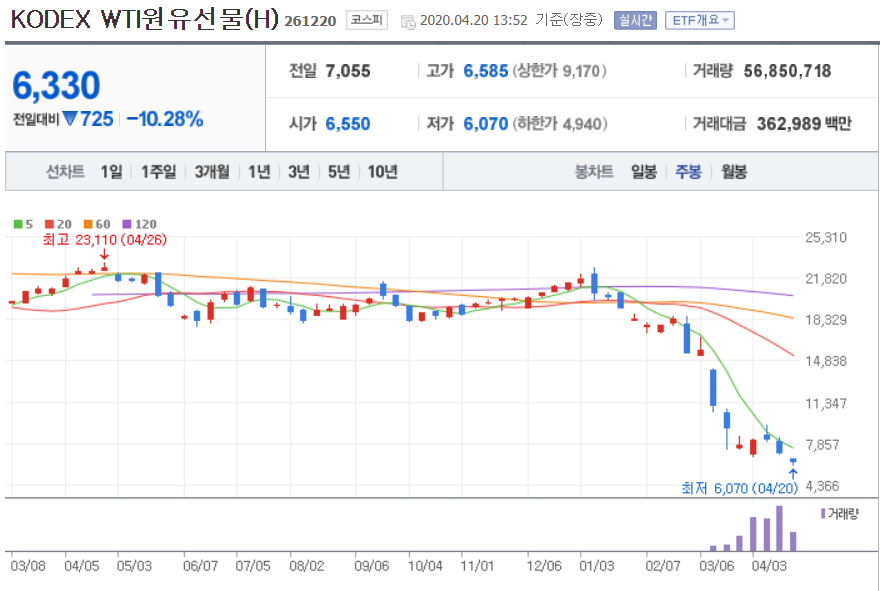 ETF투자에 그치지 않고 레버리지 ETN을 매수하여 높은 괴리율에도 불구하고, 과감한 투자를 실행에 옮겼다. 그 결과는 어떨까? 현재 유가선물 5월물은 20불이 깨진 상태이다.