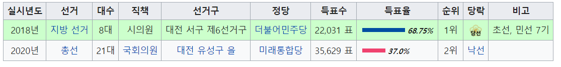 2018년 7월 1일 ~ 2020년 1월 16일 : 제8대 대전광역시의회 의원(초선, 더불어민주당 → 무소속 → 바른미래당)