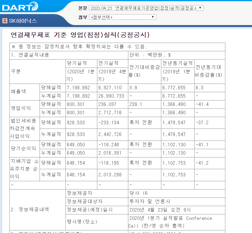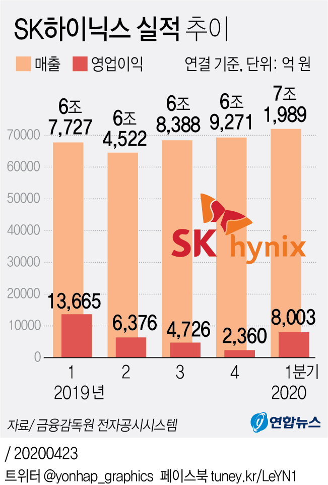 SK하이닉스는 1분기 매출이 7조1989억원, 영업이익이 8003억원을 기록했다고 23일 밝혔다.