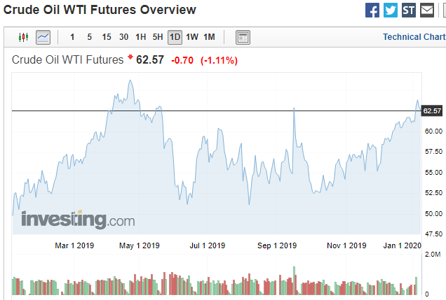 왜냐하면 미국이 아쉬운게 없기 때문이다. 2010년부터 셰일혁명으로 미국은 3대 산유국이 되었으니... 대선 전 트럼프가 신경쓸 것도 많은데 이란과의 마찰을 `장기화`시키는 전략은 지혜롭지 않을 것이다. 만일 장기화를 할거였으면, 미중 1단계 합의안도 대선 1년전에 도출되지 않았을 것이다. 위의 WTI선물은 미국vs이란의 문제가 원유시장에 직접적인 타격을 주지 않는 것을 보여준다.
