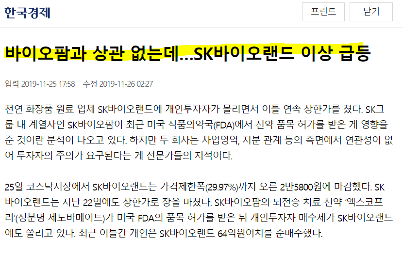 SK바이오팜의 상장은 대박일 것이다. 자 그러면 수혜주를 고민중일 것이다. 필자는 SK밖에 없다고 생각하고 공모를 받던 상장일에 시장가로 매수하는 전략 외의 관련테마를 찾는건 별 먹을게 없다고 본다.