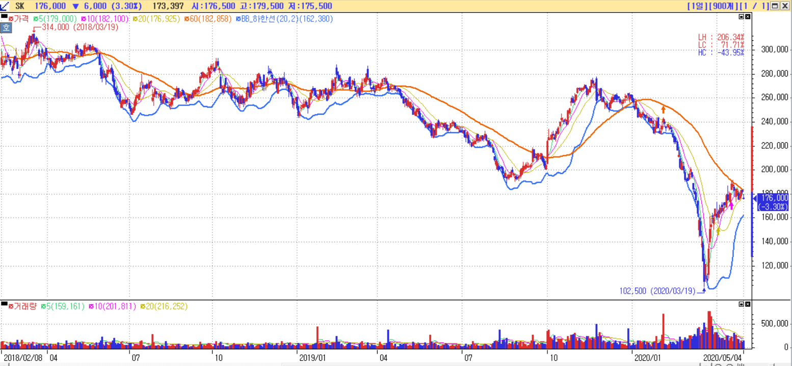 현재 지주회사 SK의 일봉차트다. 과거 하이닉스의 반도체 슈퍼사이클 때와 비교하면 정말 싼 가격이다. 코로나에, 유가로 인한 이노베이션 밸류에이션 부정적 전망 등 난관에 봉착해있다.