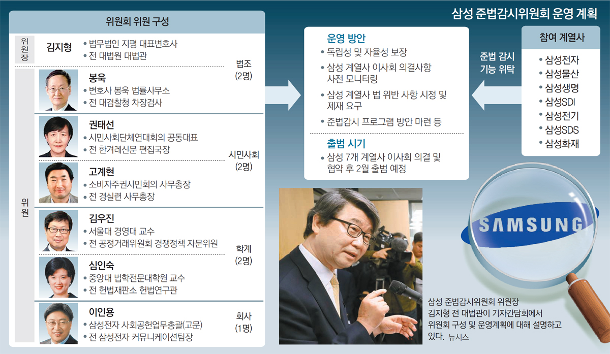 시민사회 소통과 준법감시에 대해 말쓰드리겠다. 시민사회와 언론은 감시와 견제가 그 본연의 역할이다. 기업 스스로가 볼 수 없는 허물을 비춰주는 거울이다. 외부의 질책과 조언을 열린 자세로 경청할 것이다. 낮은 자세로 먼저 한걸음 다가서겠다. 우리 사회의 다양한 가치에 귀를 기울이겠다. 준법은 결코 타협할 수 없는 가치이다. 저부터 준법을 거듭 다짐하겠다. 준법이 삼성의 문화로 확고하게 뿌리내리도록 하겠다. 저와 관련한 재판이 끝나더라도 준감위는 독립적 위치에서 계속 활동할 것이다. 그 활동이 중단 없이 이뤄지도록 하겠다.