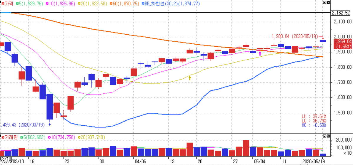 이러한 미국의 증시상승에 따라서 우리나라도 오늘 순조롭게 출발했다. 지수는 1,970pt 내외로 상승해있고, 산업은 애프터코로나로 오른 제약바이오, 언택트 관련주들은 소폭 하락하고 있다.
