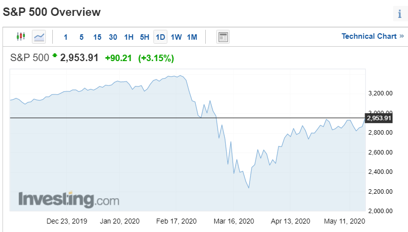 스탠더드앤드푸어스(S&P) 500 지수는 전장보다 90.21포인트(3.15%) 뛴 2,953.91에, 기술주 중심의 나스닥 지수는 220.27포인트(2.44%) 상승한 9,234.83에 장을 마감했다.