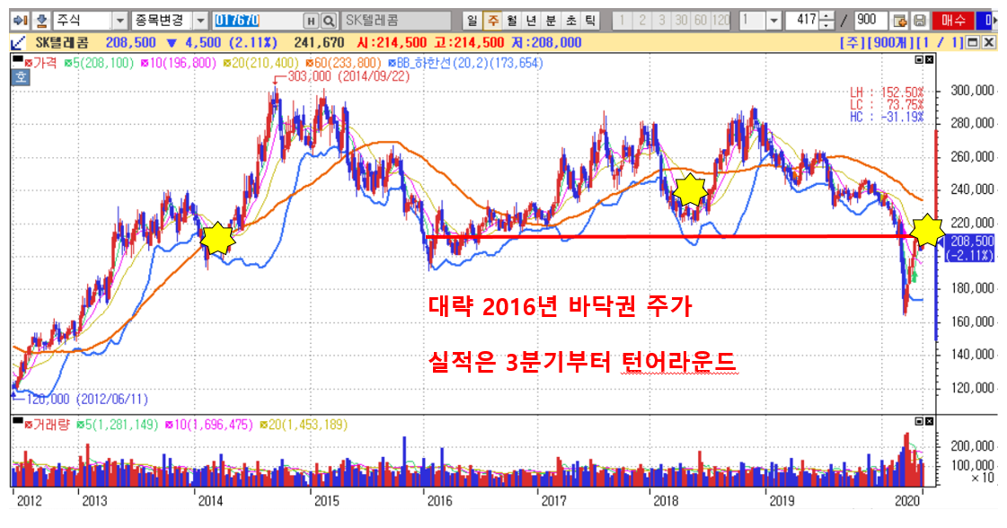 코로나로 1,400pt대에 내려왔을 때 매수했다면 좋았겠지만, 그게 말처럼 어디 쉬운가? 하지만 지금도 SK텔레콤은 부담스런 구간이 아니라고 볼 수 있다.