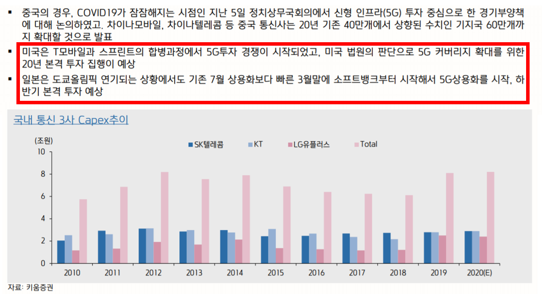 자 1분기 실적을 보고 외국인이 여러가지 방향에 대한 밑그림을 완성했다. 그런데 놀라운 것은 해외 선진국들의 의사결정이었다. 보통 현 시국에서는 코로나 대응을 위한 보건위생, 인프라투자 등 재정정책, 증세를 통한 복지 등의 예산이 편성되기 마련이다. 그러나 놀랍게도 중국, 미국, 일본은 코로나로 혼잡한 상황속에서도 5G투자를 이어나갔다. 그것도 작년보다 성장한 수치로...