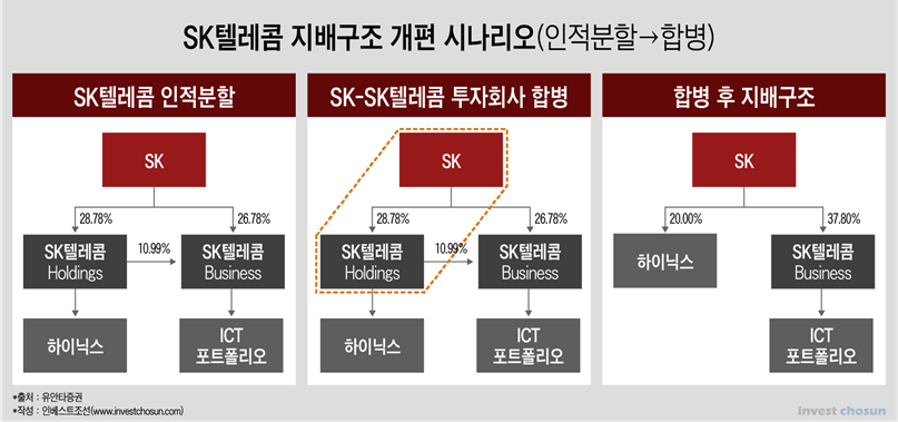 그러나 SK그룹은 SK하이닉스의 높은 주가 때문에 지배구조개편에 어려움을 겪고 있다. SK텔레콤을 인적분할하여 지주부문/사업부문으로 나눌 경우 SK텔레콤 지주회사를 SK와 합병할 것이다. 그러면 SK가 SK하이닉스를 직접지배하여 인수합병을 위한 현금유동성을 공급받지만, 그만큼 최대주주의 주가희석이 발생한다. 반면 물적분할 후 SKT 지주와 SK가 합병할 경우 여전히 SK하이닉스가 손자회사로 존재하고, 증손회사의 100% 지분인수 요건에 걸려서 어려움이 생긴다.