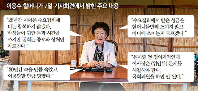 이용수는 2020년 5월 7일 대구 남구 찻집에서 기자회견을 열고 “수요집회를 없애야 한다. 하나도 도움이 안된다. 참가한 학생들이 낸 성금은 어디 쓰는지도 모른다 다음주부터 수요집회에 참석하지 않을 것”이라며 “집회가 학생들 고생시키고 푼돈만 없애고 교육도 제대로 안된다”고 말하면서 정대협 기부금과 관련하여 “현금 들어오는거 알지도 못하지만 성금·기금 등이 모이면 할머니들에게 써야 하는데 할머니들에게 쓴 적이 없다”고 했다.