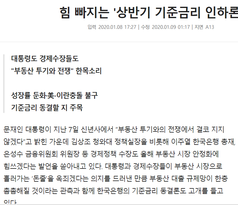 게다가 부동산 상승을 비난하는 국민여론과 객관적인 수치들을 거스르며 금리인하를 주장하기에는 2019년에 비하여 경제가 좋아질 것으로 보이기에 명분이 부족해 보인다.
