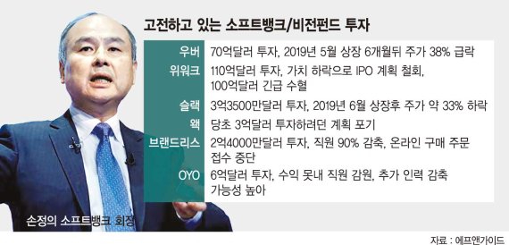 2020년 1분기에 소프트뱅크가 창사 이래 최대 적자를 기록했다. 소프트뱅크가 이날 밝힌 올해 1~3월의 적자는 1조4381억엔(약 16조5545억원)이다. 일본 기업의 분기 적자 액수로는 사상 최대 규모다. 이전까지 일본 기업 최악의 분기 적자액은 2011년 동일본 대지진 당시 도쿄전력 홀딩스가 기록했던 1조3782억엔이었다. 소프트뱅크의 적자는 손 회장이 주도하는 10조엔 규모의 ‘비전 펀드’를 통한 투자 사업이 실패한 결과다. 손 회장의 비전 펀드는 위워크(WeWork)ㆍ우버 등 스타트업 기업 투자 실패로 약 1조9000억엔의 손실을 냈다. 코로나19로 인한 소비 위축도 실적 악화에 큰 영향을 미쳤다고 손 회장은 결산 발표에서 직접 밝혔다. 이탓에 손정의(孫正義) 회장 스스로 “인생관을 되돌아보고 있다.”라는 발언까지 할 정도였다.