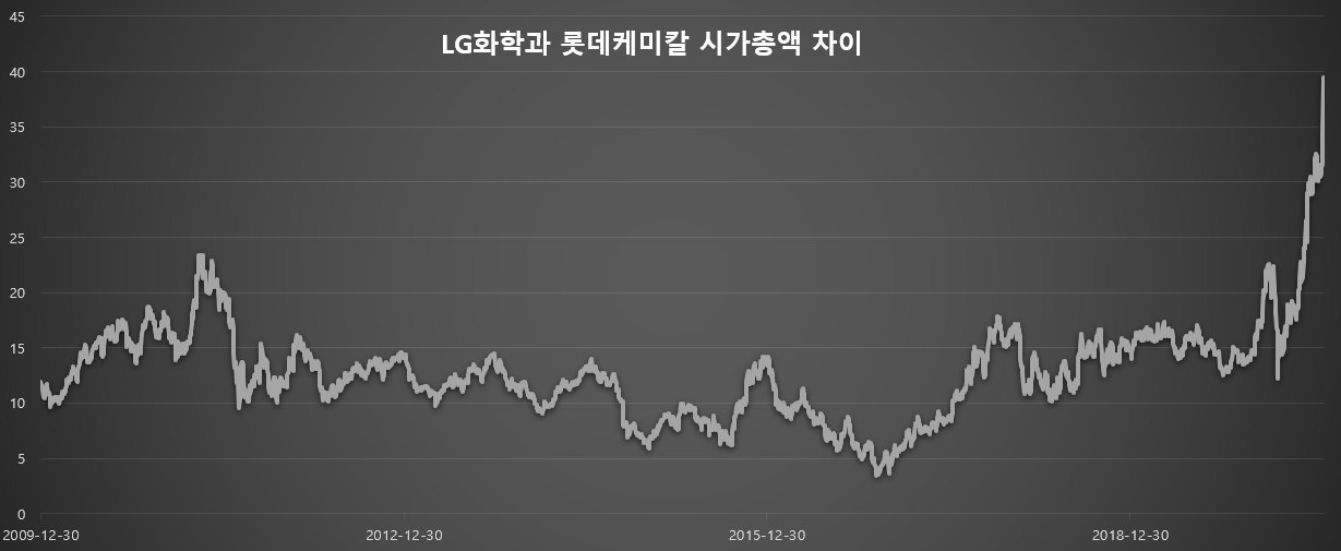 요약하자면, LG화학과 롯데케미칼의 시가총액의 차이에 관한 코멘트이다. 2차전지라는 미래먹거리를 가진 LG화학과 기존의 화학산업의 밸류만 받고 있는 롯데케미칼을 비교한 것이다.