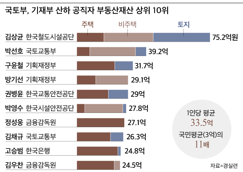 국토부, 기재부 산하의 고위공직자들을 보면 자산가들이 산재해있다. 한국철도시설공단의 김상균씨가 75억원가량의 재산을 갖고 있고, 국토교통부의 박선호씨가 39억을 소유하고 있다.