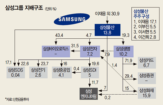 이재용이 지배하고 있는 삼성물산은 삼성전자에 4.7% 지분을 소유하고 있다. 삼성전자가 500조라고 치면 24조정도 되는 것이다. 그렇다면 삼성물산의 시가총액은...? 26조원에 불과하다.