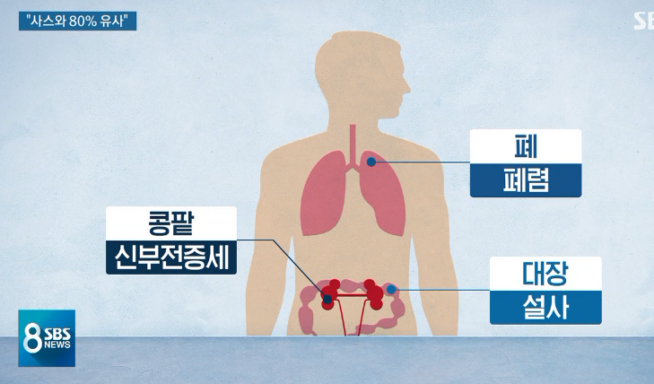 이어서 중국 당국은 사스와 80%가 비슷한 코로나 바이러스 계열이라고 발표했다. 그런데 사스의 증상인 폐렴, 신부전증세, 설사 중 폐렴만이 우한 폐렴의 증세로 발표했다 ㅡㅡ;;;