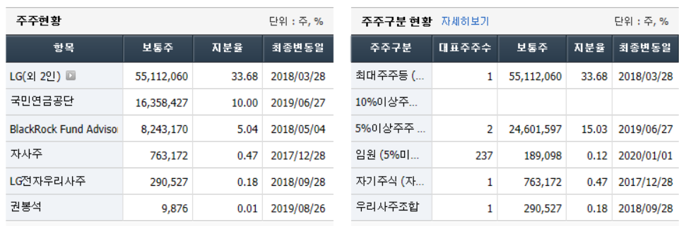 LG전자의 지배구조는 지주사인 LG가 약 33%를 소유하고 있으며, 국민연금공단이 10%, 블랙록 펀드가 5%가량을 소유하고 있다.