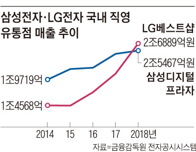 그러나 막연히 LG전자의 매출이 하락할 가능성만 있는건 아니다. 위의 LG전자 국내 직영 유통점 매출추이를 보면, 2018년 삼성전자를 추월했다. LG베스트샵은 기존의 강자이던 삼성디지털프라자의 점유율을 급격히 뺏어왔다.
