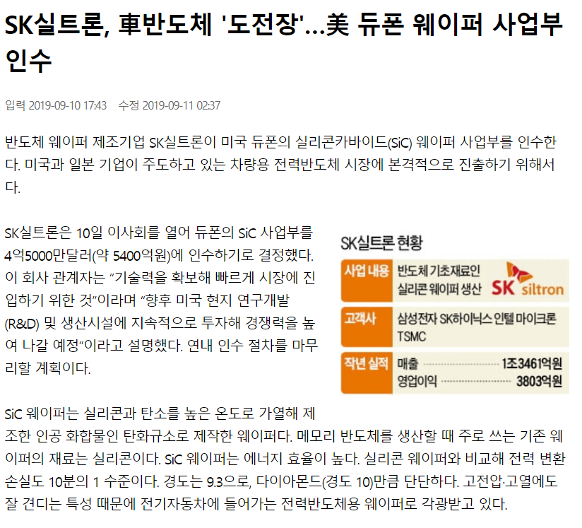SK실트론은 1983년 만들어진 반도체 웨이퍼 생산제조를 영위하는 회사이다. 작년 9월 세계적 화학기업 듀폰사에서 DDP Specialty Electronic Materials US 9, LLC와 SiC Wafer 생산과 관련한 기계장치, 특허권 등을 포함한 사업부를 4.5천만 달러에 인수했다.