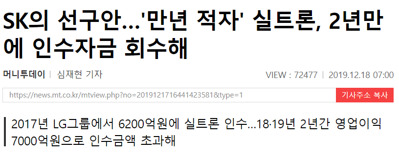 사실 SK가 LG에서 인수할때만해도 모두가 인수적정성에 의문을 가졌던 기업이다. 그러나 인수후 실적개선이 무섭게 이루어져 "M&A = SK"라는 공식이 맞아 떨어졌다.