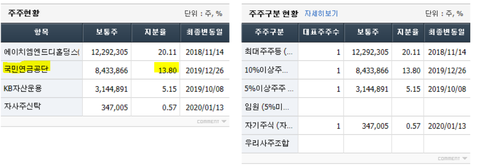 휠라홀딩스는 국민연금이 13.80%를 소유하고 있다. 그리고 대주주가 20%의 지분을 갖고 있으며 KB자산운용이 5.15%를 갖고 있다.