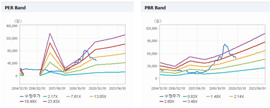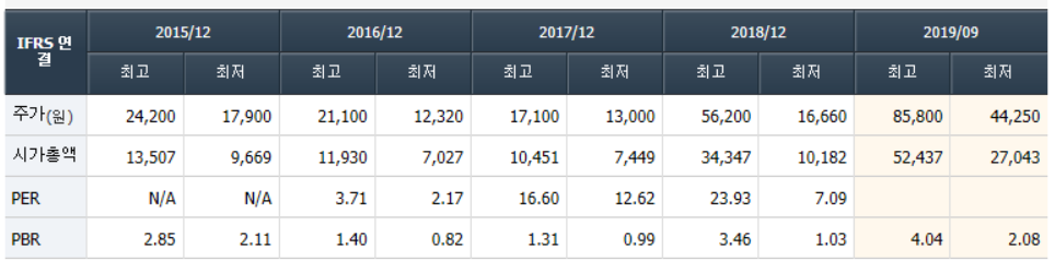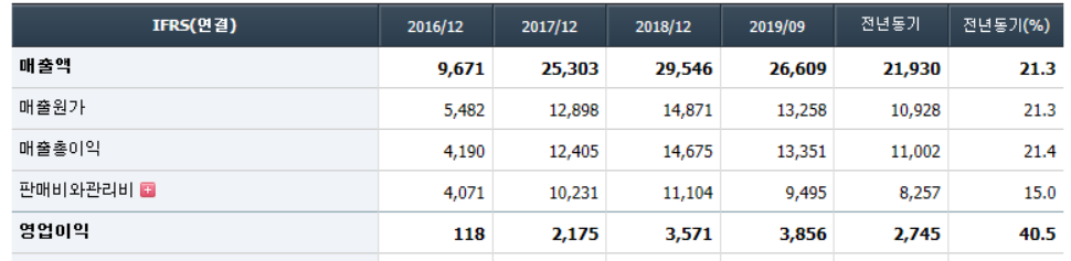 매출을 보자면, 사실 2018~2019년의 주가상승은 과대한 것 같지는 않다. 우선 매출액이 2017년부터 3배 이상 증가했으며 영업이익은 20배까지 상승했다. 그렇게 꾸준한 상승세를 기록하며 2018년도부터 3천억 이상의 영업이익을 기록할 것으로 보인다.