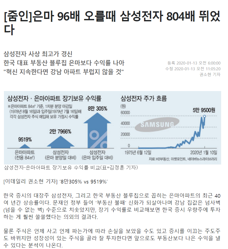 20년간 배당까지 고려하면 엄청난 수익률이다. 삼성전자는 메리츠자산운용 존리 대표, 에셋플러스 강방천 대표 외에도 수많은 주식매니저들이 보유하여 높은 수익률을 쌓은 종목이다.