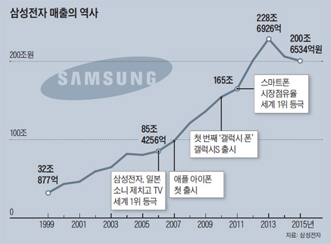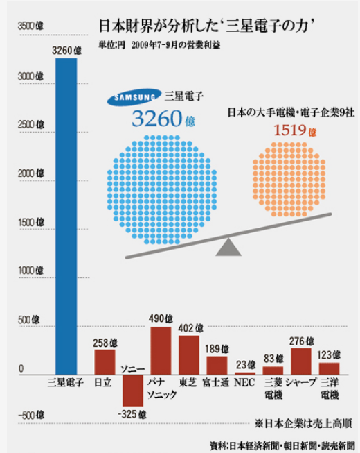파란색 막대는 삼성전자, 빨간 막대는 좌측부터 히타치, 소니, 파나소닉, 도시바, 후지쯔, NEC, 미쯔비시전기, 샤프전자, 산요 순으로 표기하고 있다. 여기에 LG전자도 넣으면, 한일 전자기업의 격차는 더 벌려진다." -출처: 나무위키-