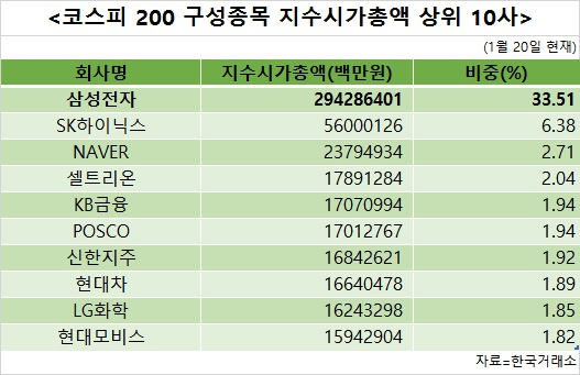 SK하이닉스가 코스피200에서 두번째 비중을 차지한다. 세번째는 시총 3위인 삼성전자우가 아닌 NAVER이다.
