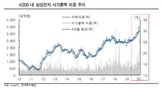 코스피200지수가 삼성전자의 변동성에 맞춰 등락을 거둘 것이기 때문에, 다른 산업군의 외국인 수급에 악영향을 주기 때문이다.