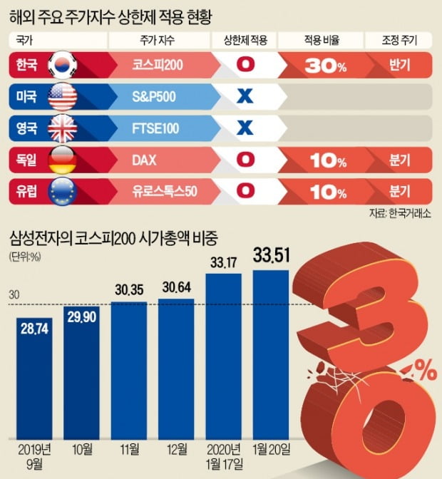 한국거래소는 코스피200 지수 중 시가총액 비중 상한제도(일명 CAP)를 삼성전자에 적용하는 방안을 검토중이라고 한다.