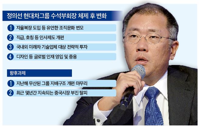 정의선 부회장은 자율복장도입으로 조직의 유연성을 넓히고자 노력했고, 직급과 호칭 등의 인사제도를 개편했다.