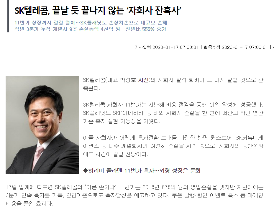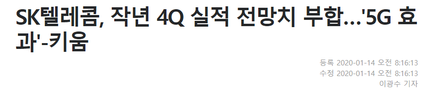 키움증권에서 나온 기사와, CEO스코어데일리의 기사이다. 지난 19년 4분기 연결 매출액과 영업이익은 4조 5천억원, 2천3백억원 정도로 시장 컨센서스(영업이익 2천 7백억원)정도에 근접할 것으로 보인다. 작년 KT, LG 유플러스 등 라이벌 통신사들과의 경쟁완화로 보조금 규모는 축소되었으나, 2~3분기에 발생한 대규모 마케팅 경쟁으로 인해 눈에 띄는 실적개선은 이루어지지 않은 것으로 보인다.