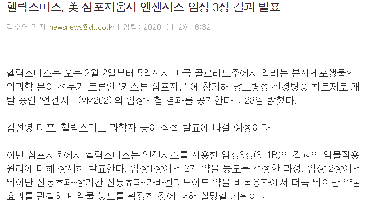 작년 큰 주가상승으로 어려움을 겪었던 헬릭스미스기 때문에 엄청난 공을 들였을 것으로 보인다. 헬릭스미스에 따르면 이번 발표를 통해 엔젠시스가 안전성과 유효성을 갖춘 재생의약이라는 점이 부각될 것으로 기대감이 크다고 전했다.