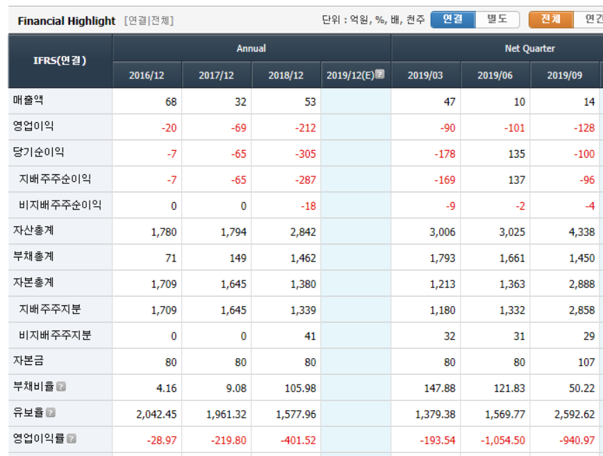 정말 무서운 재무제표이다. 매출액은 2018년 53억원이지만 300억원의 당기순손실을 기록했다. 삼성바이오로직스나 셀트리온처럼 양상으로 돈을 버는 기업이 아닌 헬릭스미스처럼 기대감으로 주가가 움직이는 기업의 재무제표는 위와 대동소이할 것 같다. 모든 투자에서 불확실성은 기회이자 위험이다. 하지만, 자신이 쉽게 파악할 수 없는 비즈니스구조를 갖춘 기업에게 소중한 투자를 결정하는 것은 쉽지 않은 것 같다.