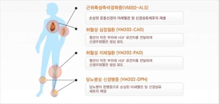 임상단계 파이프라인으로는 VM202, VM206으로 DNA 기술기반의 신약으로 당뇨병성신경병증, 족부궤양, 루게릭병, 유방암 등 질병을 치료하는 라인으로 구성되어있다. 또한 DNA 기술기반 외에도 단백질 기반의 VM501 파이프라인도 보유하고 있다.