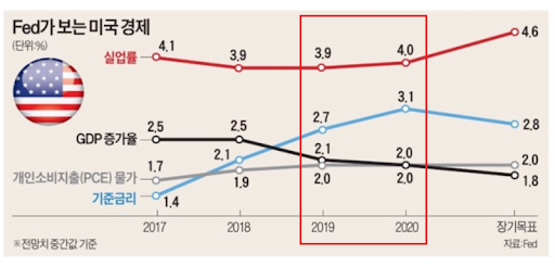 최근 연준의 발표에 따르면 미국 고용시장과 소비 지출이 강한 상태를 유지했다고 발표하였으며 "미국 경제의 하방 위험성은 작년 하반기에 약화한 것 같다"며 "무역정책을 둘러싼 갈등이 다소 줄어들고 해외의 경제 성장세는 안정화하는 신호를 보여줬으며 금융 여건도 완화했다"고 말했다.